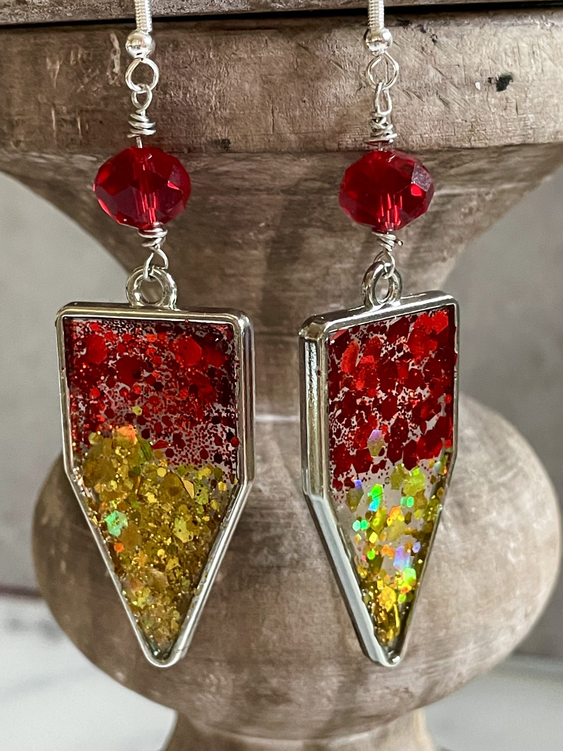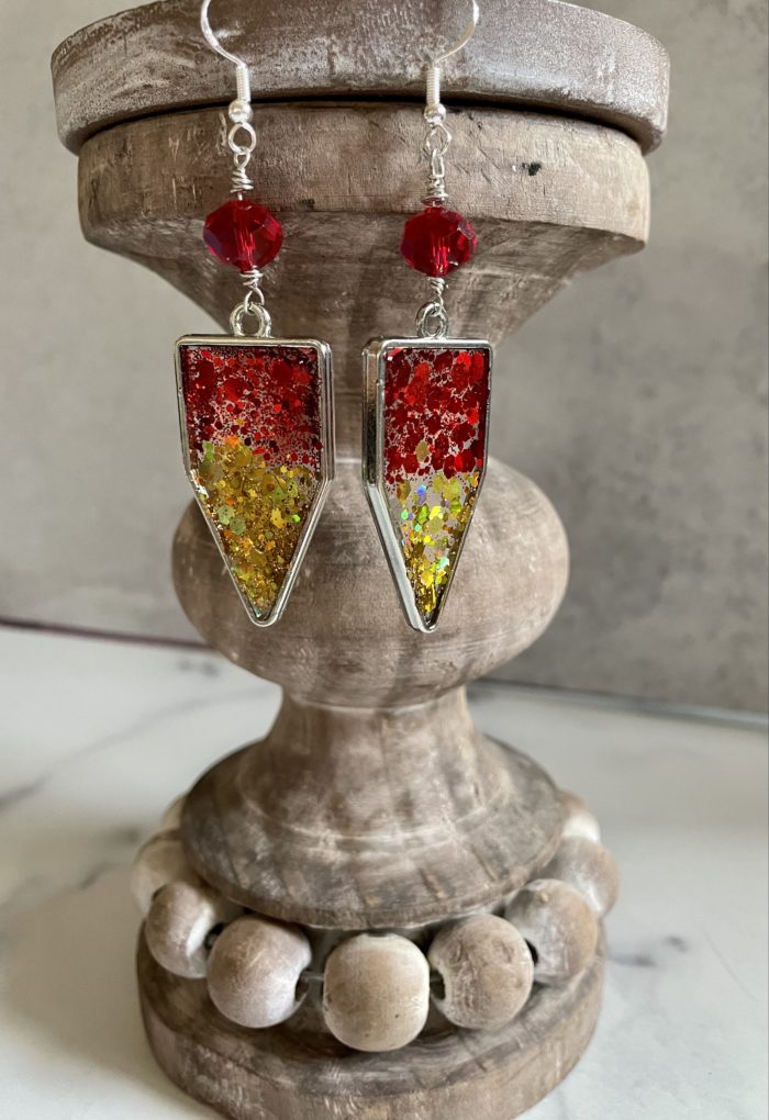 Made with resin, glitter, faceted red crystal, tarnish resistant wire and hypoallergenic earring hooks.
